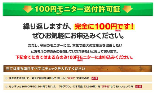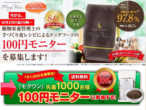 インターネットの広告を使って、お試しモニターとして100円でモグワン100gを試すことが出来るキャンペーンです。