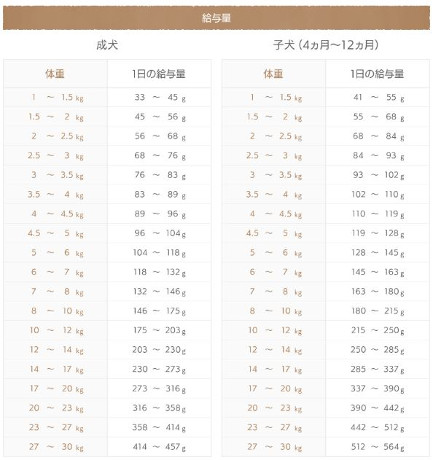 与える量を決めるには、給与量の目安表で愛犬の体重に該当する「1日の給与量」を確認します。