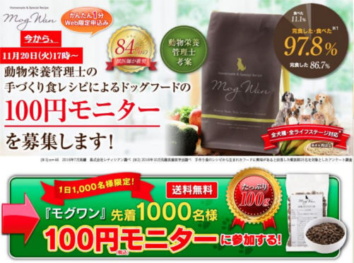 モグワンの100円モニターとは、モグワンが100g入ったサンプルを100円で送ってもらえるお試しキャンペーンの事です。