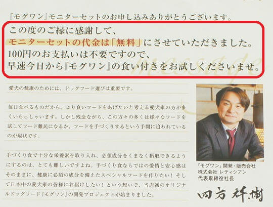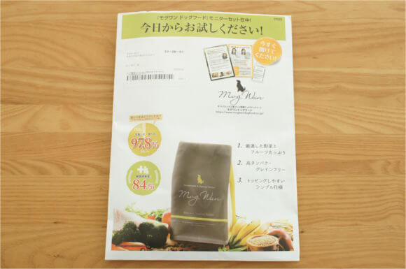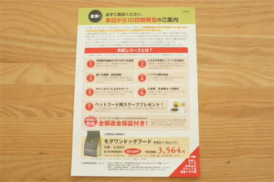 モグワンの100円モニターを申し込んで送られてくる商品と一緒に10日間限定で申し込みができる「お試しコース」の案内チラシが入ってきます。