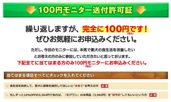 モグワンの100円モニター募集ページを見ると、「100円モニター送付許可証」という項目で、以下の2つの条件にあてはまる場合に、100円モニターの申し込みが出来るようになっています。